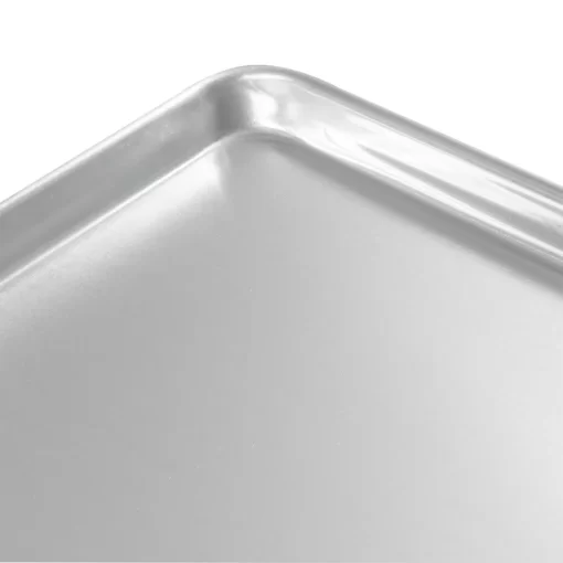 The Winco ALXP-1826 sheet pan is full sized, measuring 26 inches long and 18 inches wide. It is constructed from 18-gauge aluminum and includes a closed bead edge with galvanized wire reinforcement. This aluminum sheet pan is designed to endure heavy use for baking and broiling.